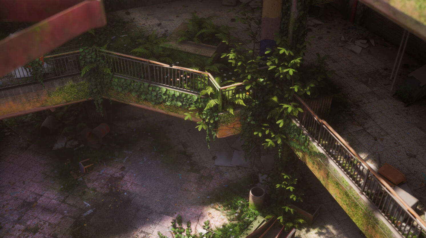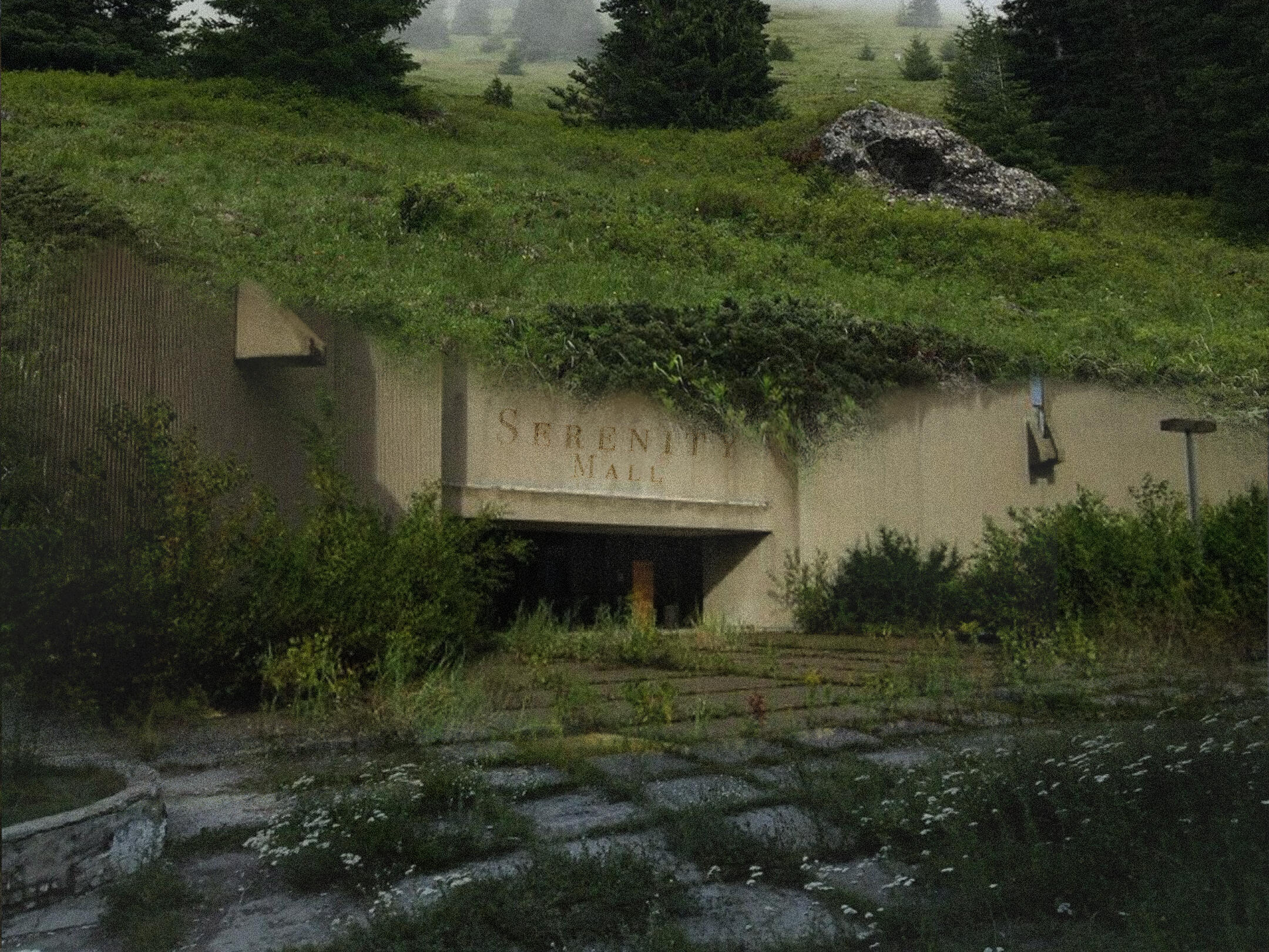 The mall is overgrown now as nature has reclaimed her territory. Nothing in there works because of flooding, plant growth, and mold damage, causing the upper floor to become unstable as well. Intruders must take caution when entering the building.